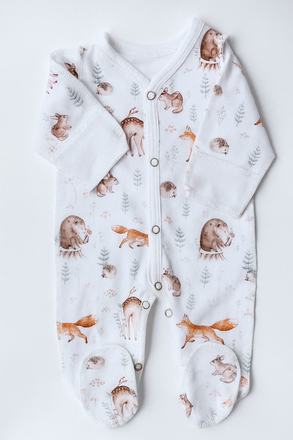 Šūts no cilpiņtrikotāžas (95% kokvilna, 5% elastāns) ar OEKO-TEX® Standard 100 sertifikātu — droši mazuļa pirmajām dienām un ikdienai.