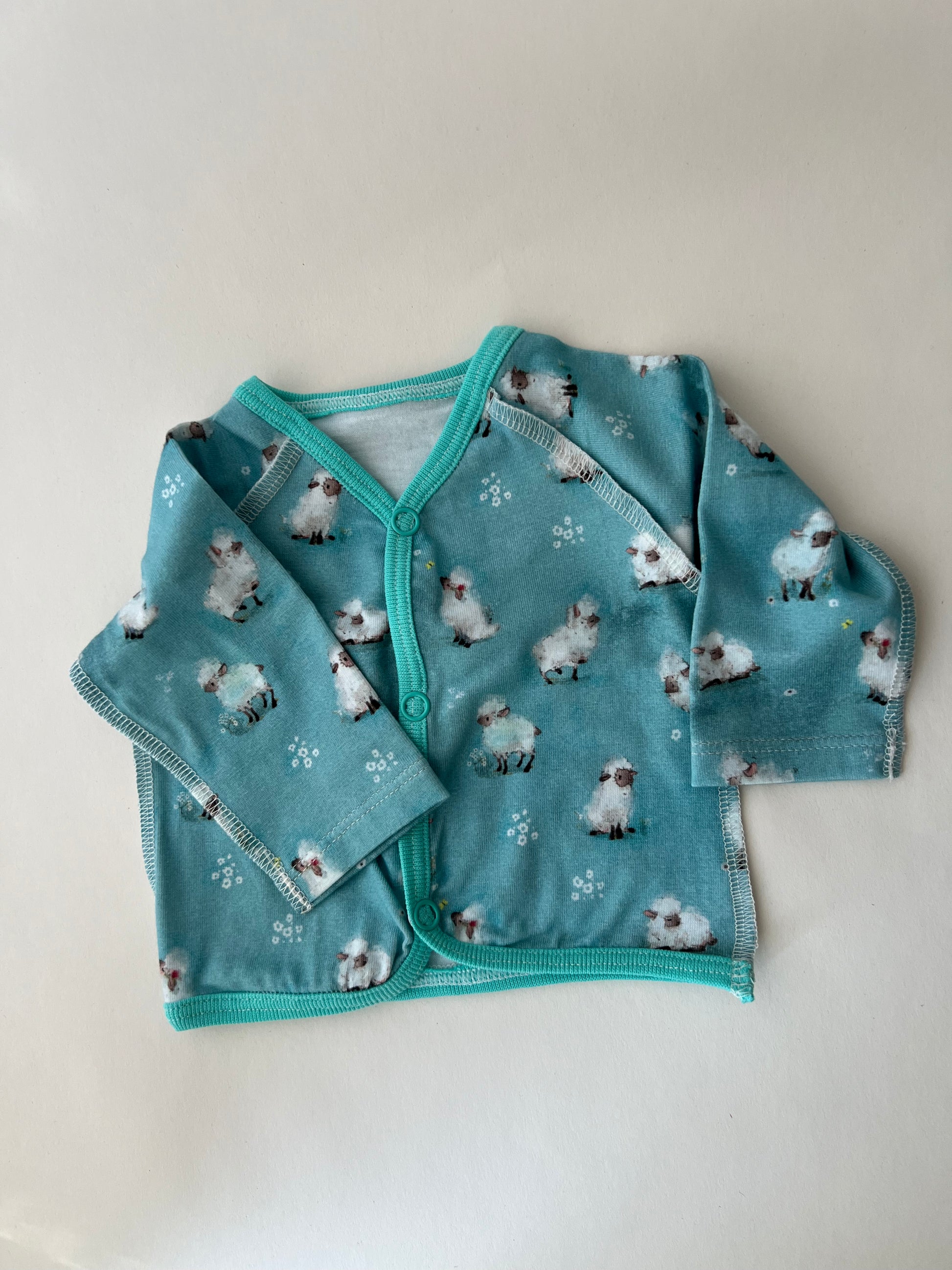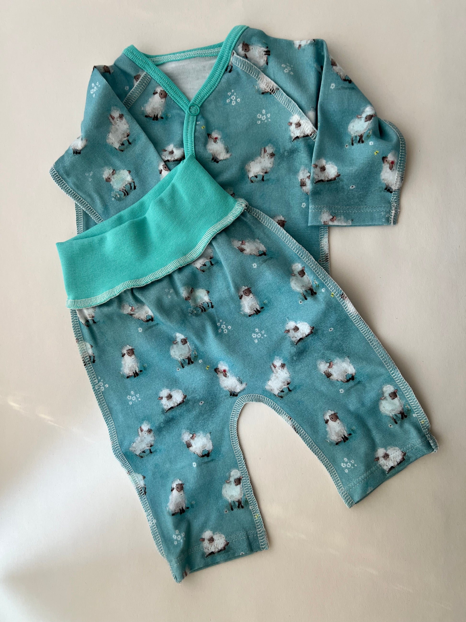 Šis mazais komplekts ar gaišām aitiņām uz zilā fona ir radīts īpaši priekšlaicīgi dzimušiem mazuļiem — lai pirmajās dienās viss būtu maigs, silts un drošs.
