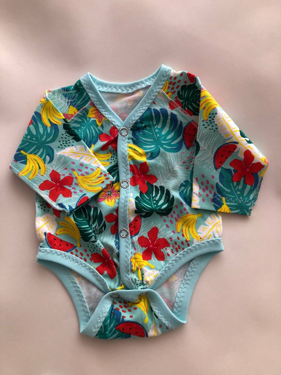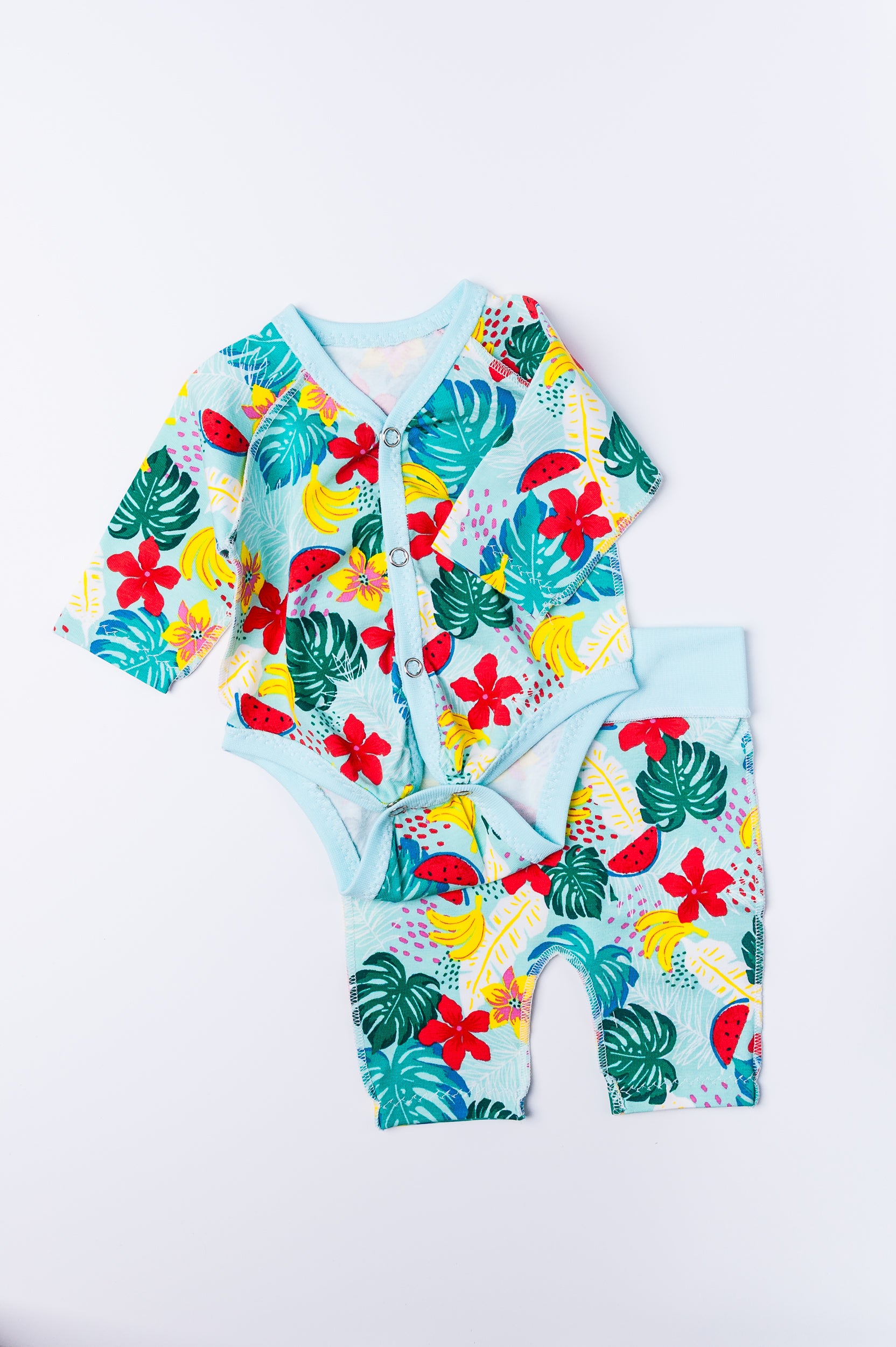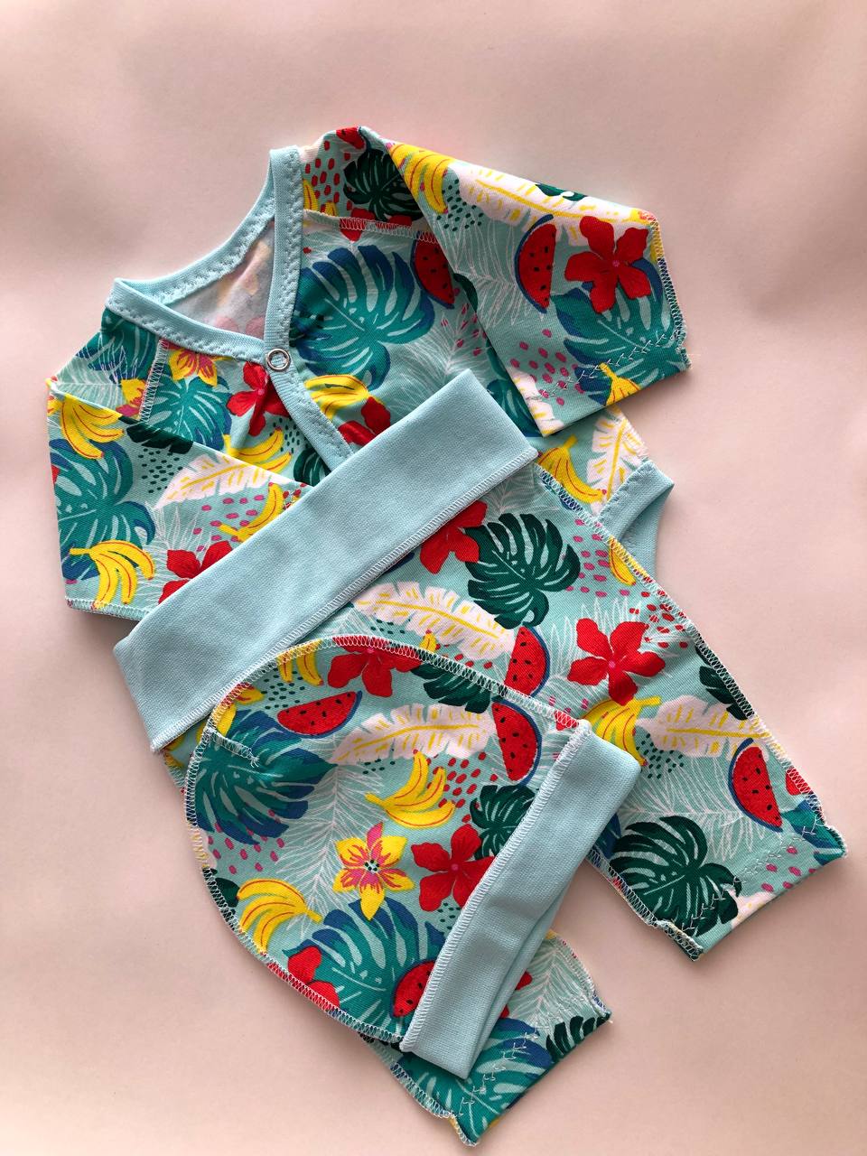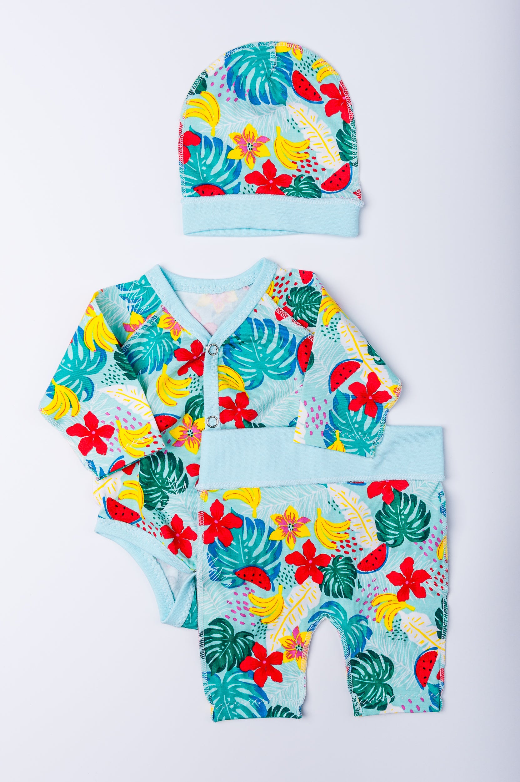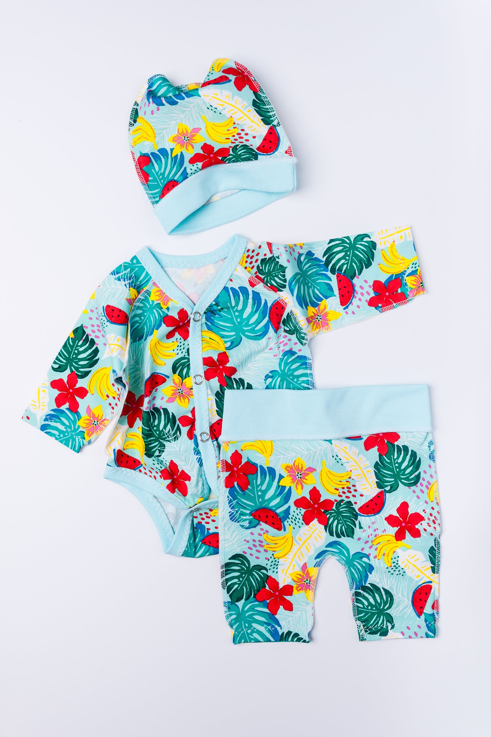 Komplekts “Tropu paradīze” 44–46 — bodijs, biksītes un cepurīte, kokvilnas trikotāža