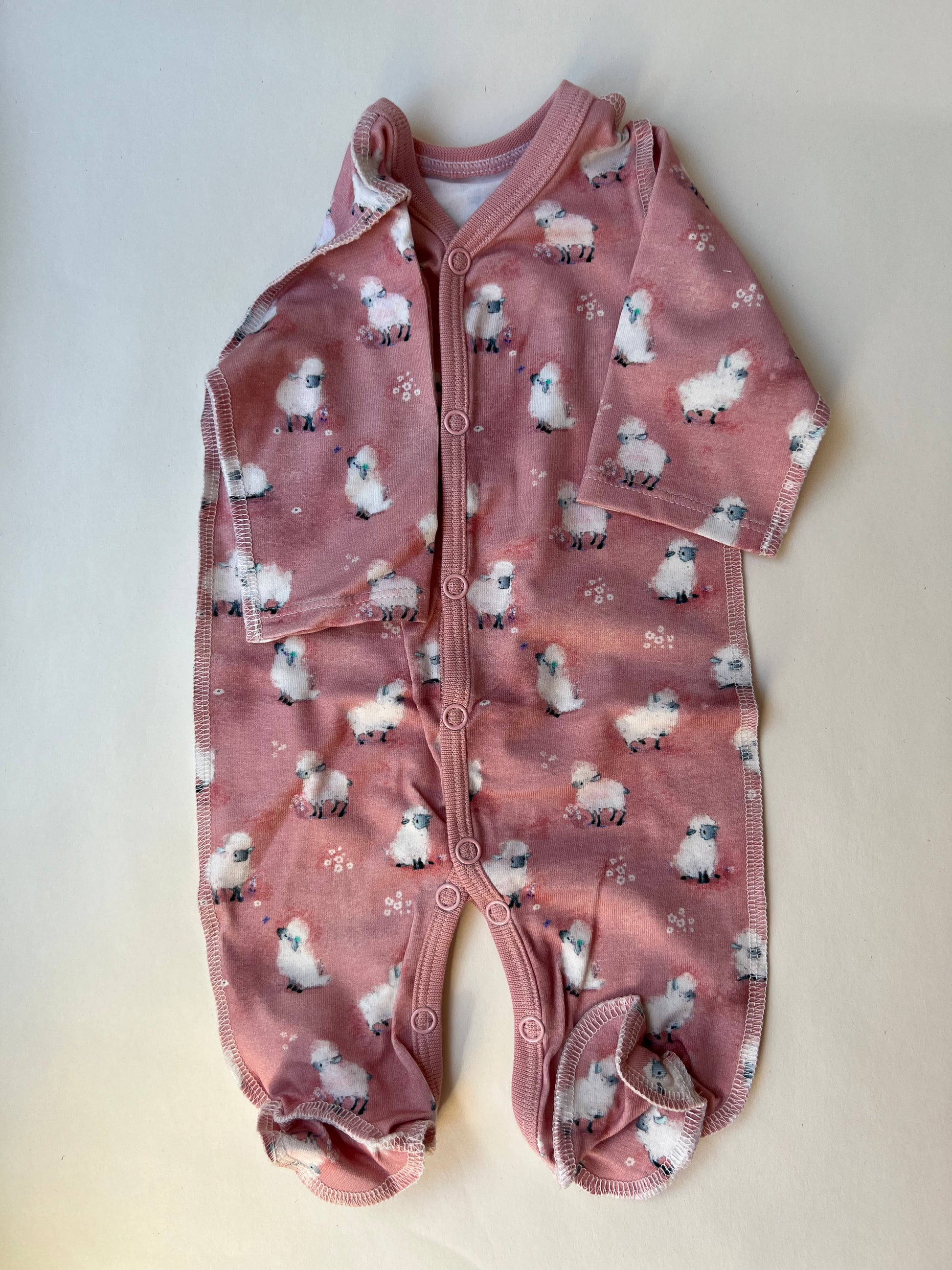 Этот нежный комбинезон (размер 44–46) со светлыми овечками на розовом фоне создан специально для малышей, рождённых раньше срока — чтобы в самые первые дни всё было тёплым и безопасным.