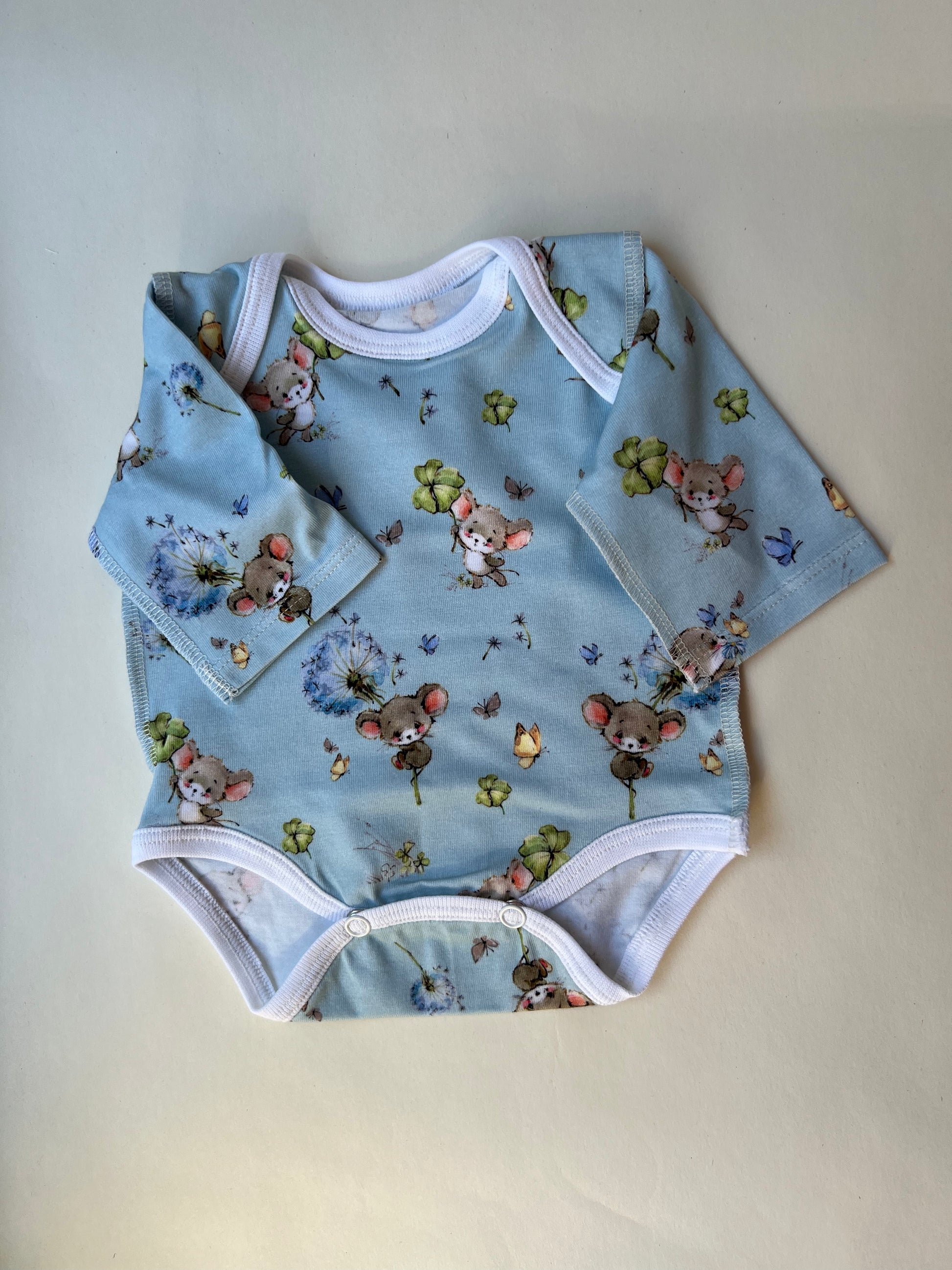 Комплект “Сказка о мышках” 46 — бодик с наружными швами, шапочка и штанишки