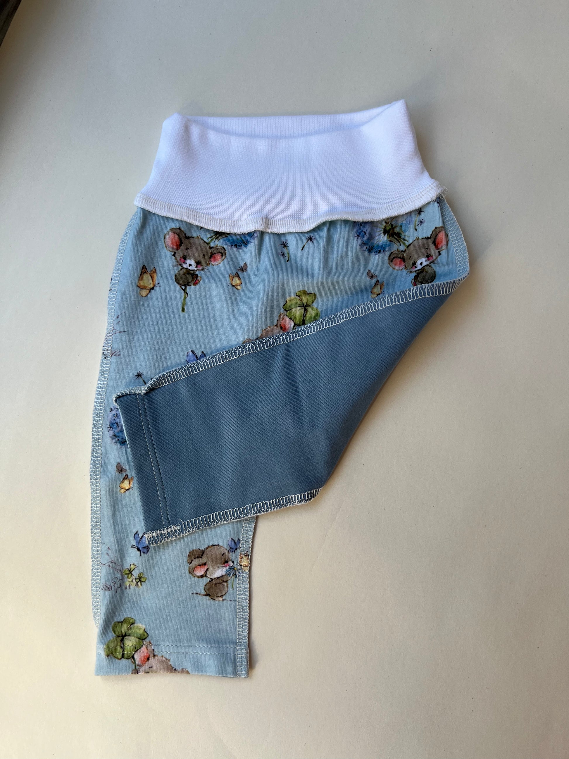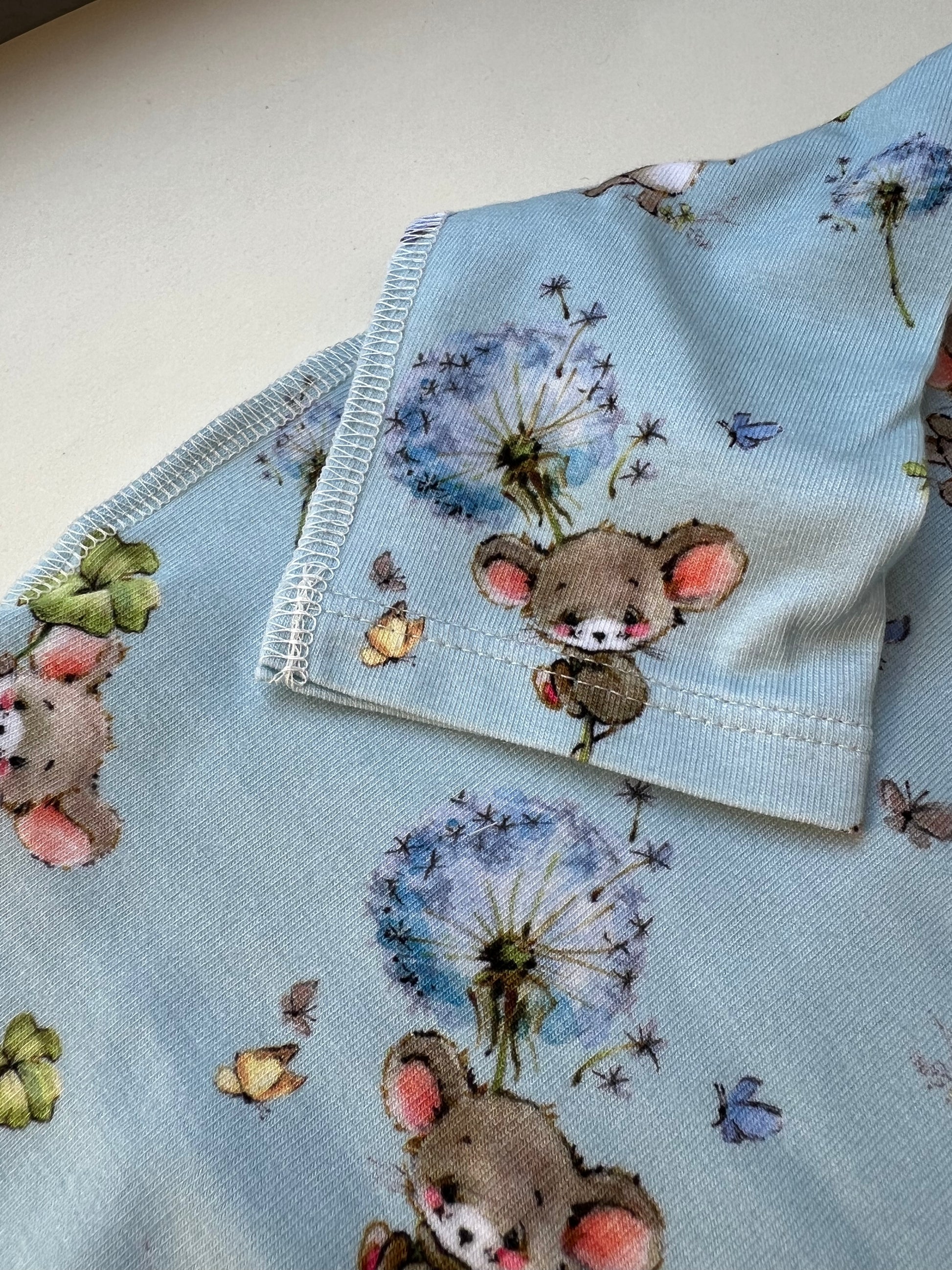 – Передняя часть с рисунком мышек, задняя — однотонная голубая.