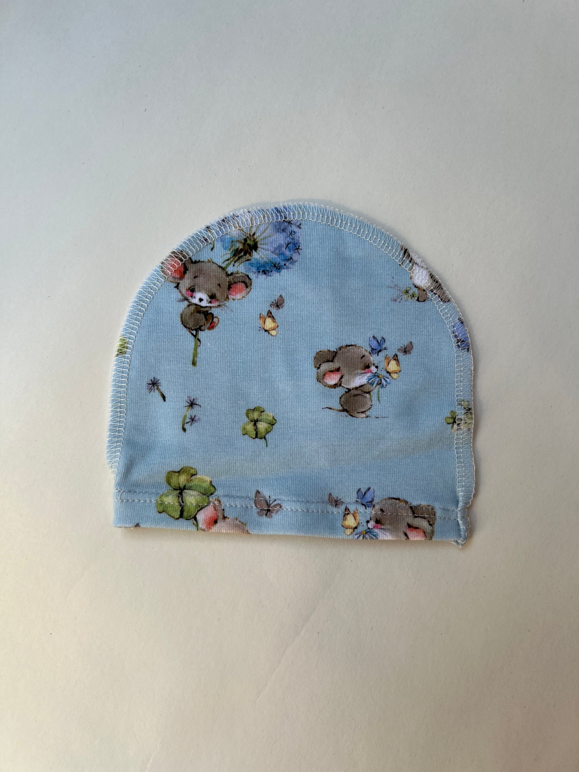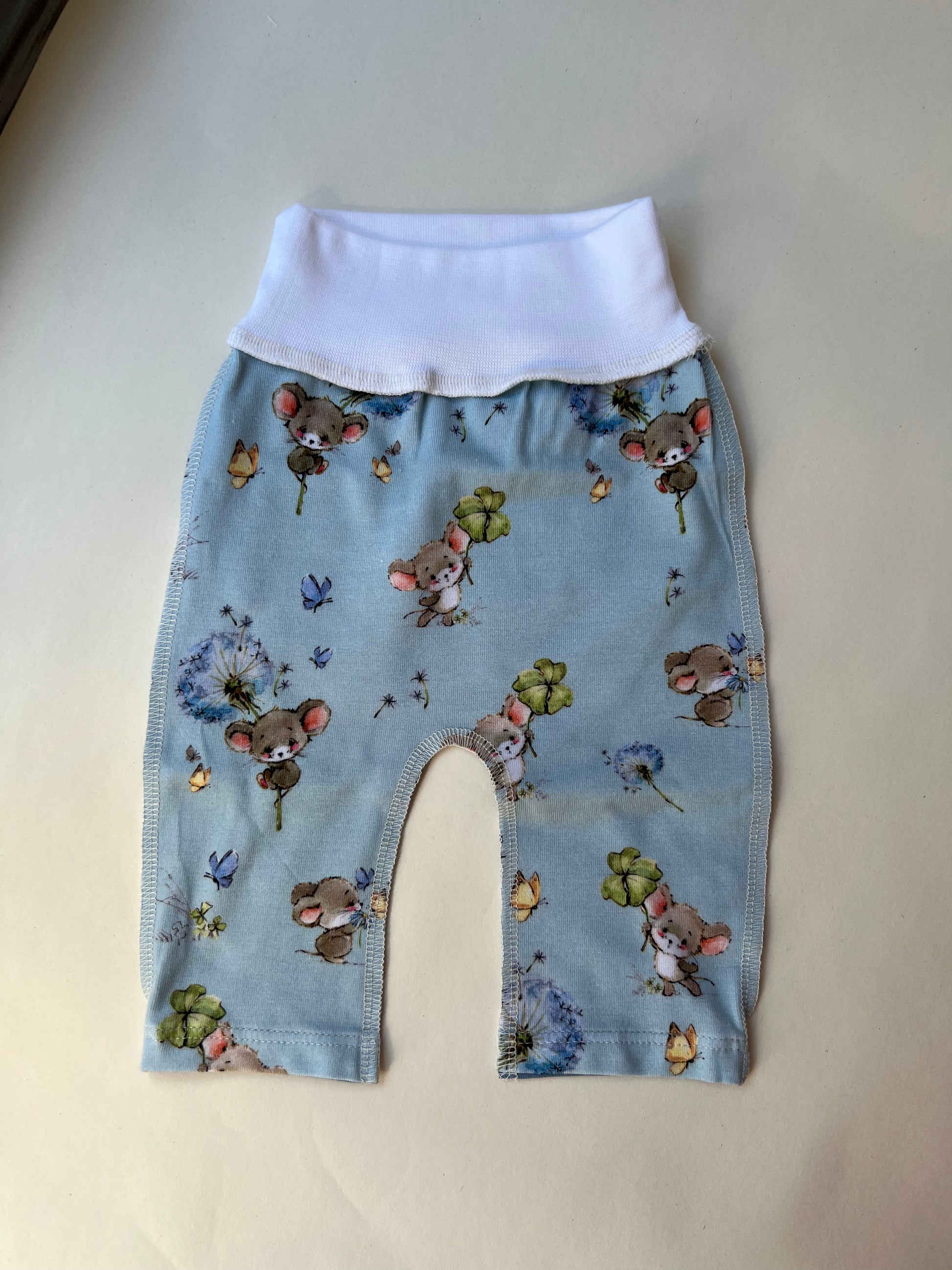 Этот маленький комплект (размер 46) с голубыми мышками создан специально для малышей, рождённых раньше срока — чтобы в самые первые дни всё было мягким, тёплым и безопасным.